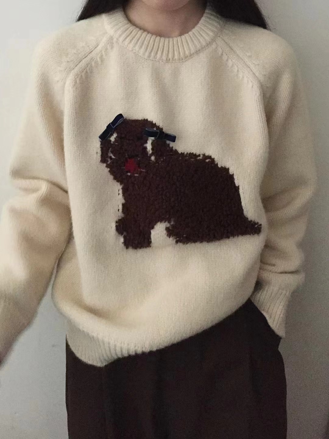 Fluffy dog embroidered round neck sweater knit パピードッグ編み込みラウンドネックのプルオーバーセーターニット [2510-a971035875047]